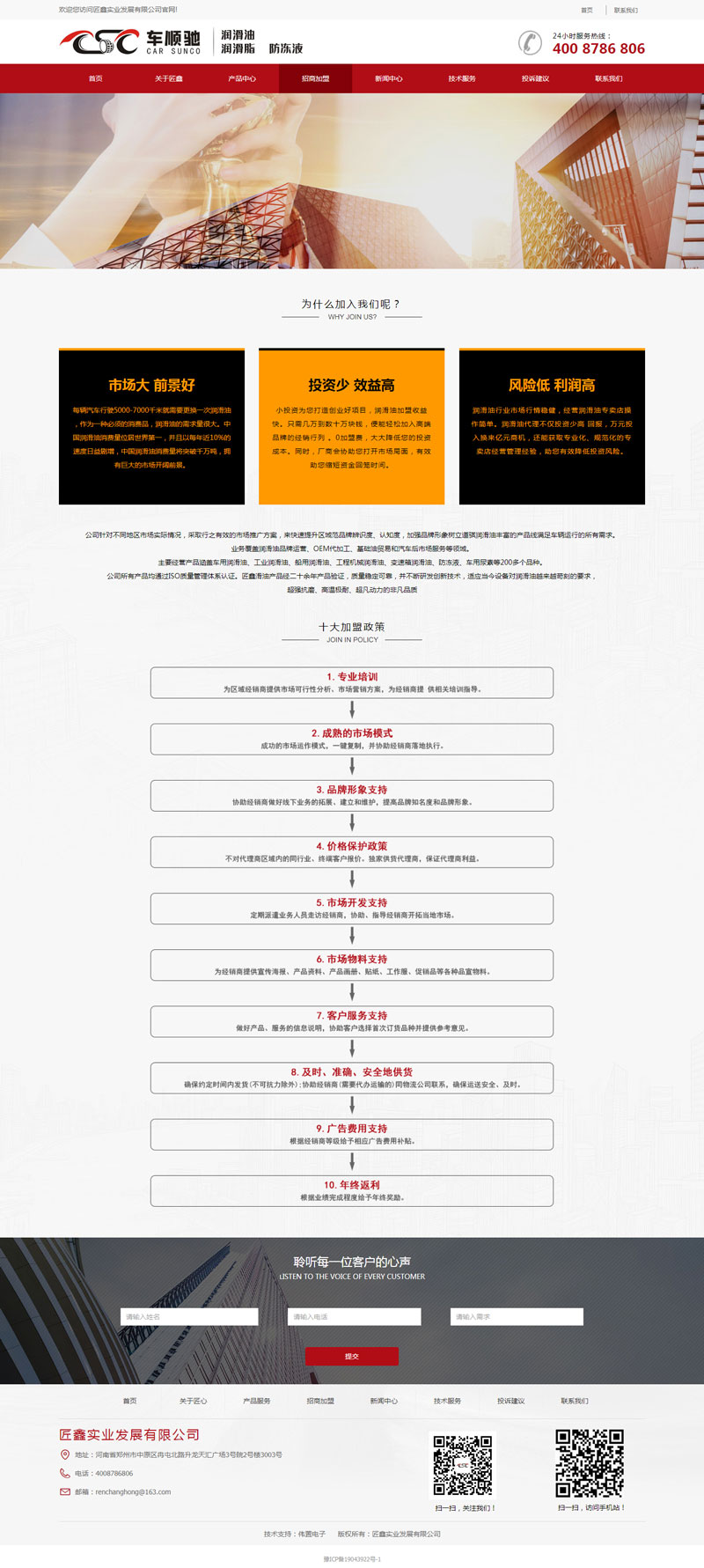 頁面簡潔大方,網(wǎng)站以紅、黑、白為主色調(diào),色彩搭配協(xié)調(diào),更能突出重點。招商加盟欄目以單頁的形式展示,內(nèi)容豐富,更能吸引客戶。