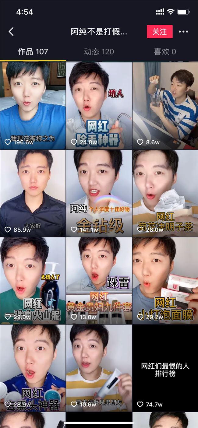 阿純其實(shí)很聰明,建立了兩個(gè)賬號:一個(gè)賬號打假測評,樹立人設(shè);一個(gè)賬號變裝獵奇,積累粉絲,為自己的另一個(gè)賬號引流。