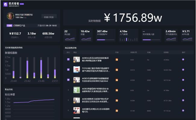 8 月 29 日,阿純的直播GMV達(dá)到了1756. 89 萬。其中單價(jià)達(dá)到 419 的肌底液,單品GMV就達(dá)到了229. 7 萬。單價(jià) 69 元的洗面奶銷量達(dá)到了 5 萬件!