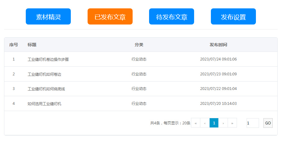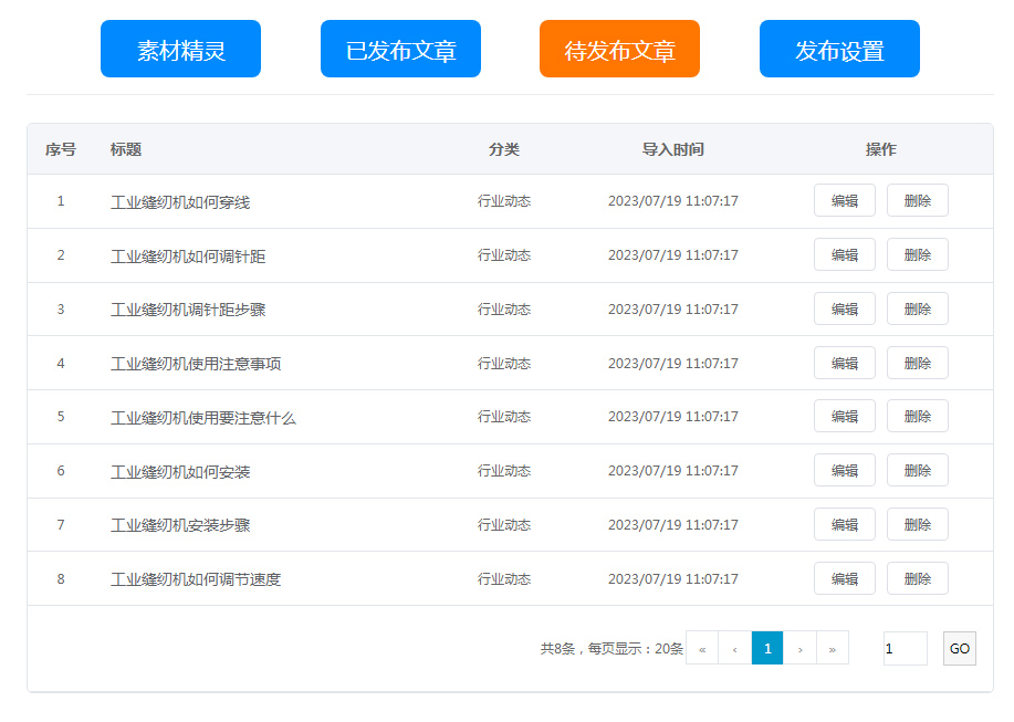 待發(fā)布文章:素材精靈里生成獲取的文章內(nèi)容,導(dǎo)入進(jìn)來(lái),等待發(fā)布到網(wǎng)站上,支持二次修改與刪除;